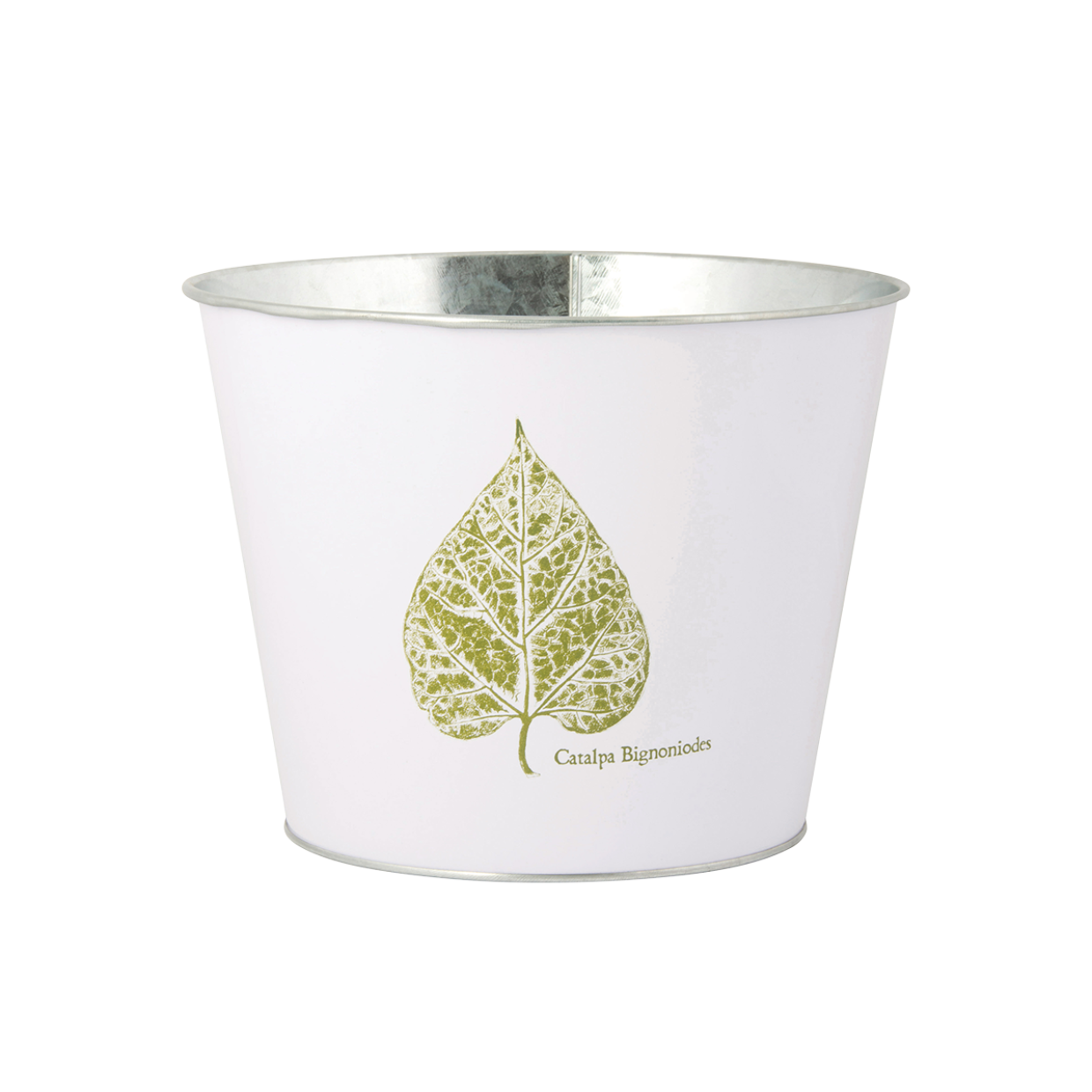 Doniczka z pełnym dnem na wszystkie rodzaje roślin z nadrukiem liścia katalpy i jego łacińską nazwą. Ożyw swój stół ogrodowy lub parapet.
