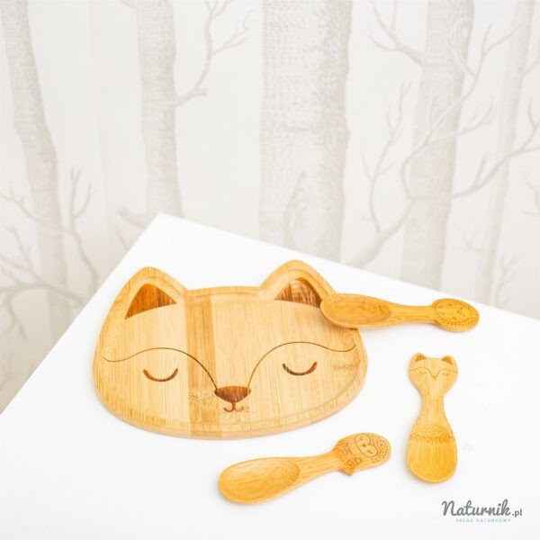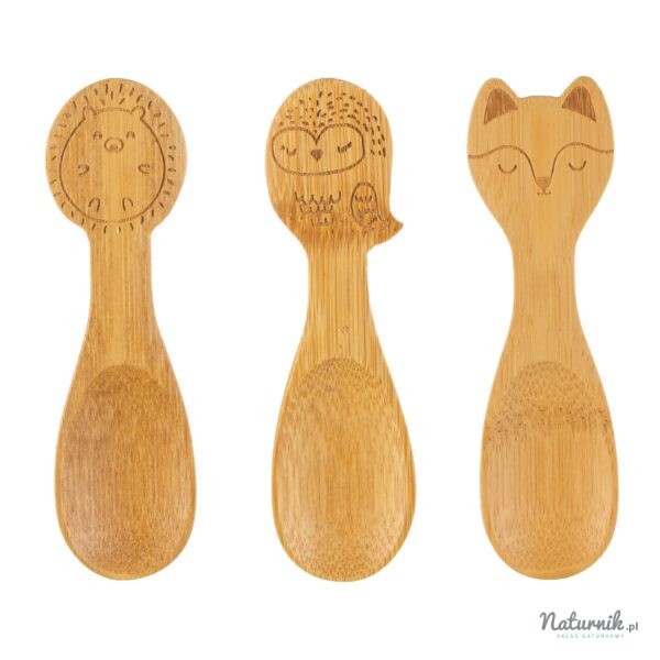 Zestaw trzech łyżeczek wykonanych z bambusa przyjaznego planecie – puszczyk, lisek i wesoły jeż.